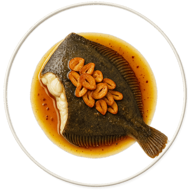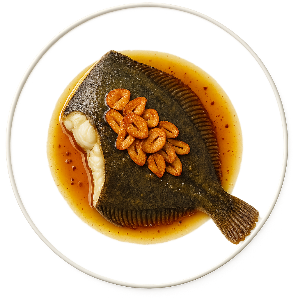 Rodaballo salvaje con refrito de ajos.
